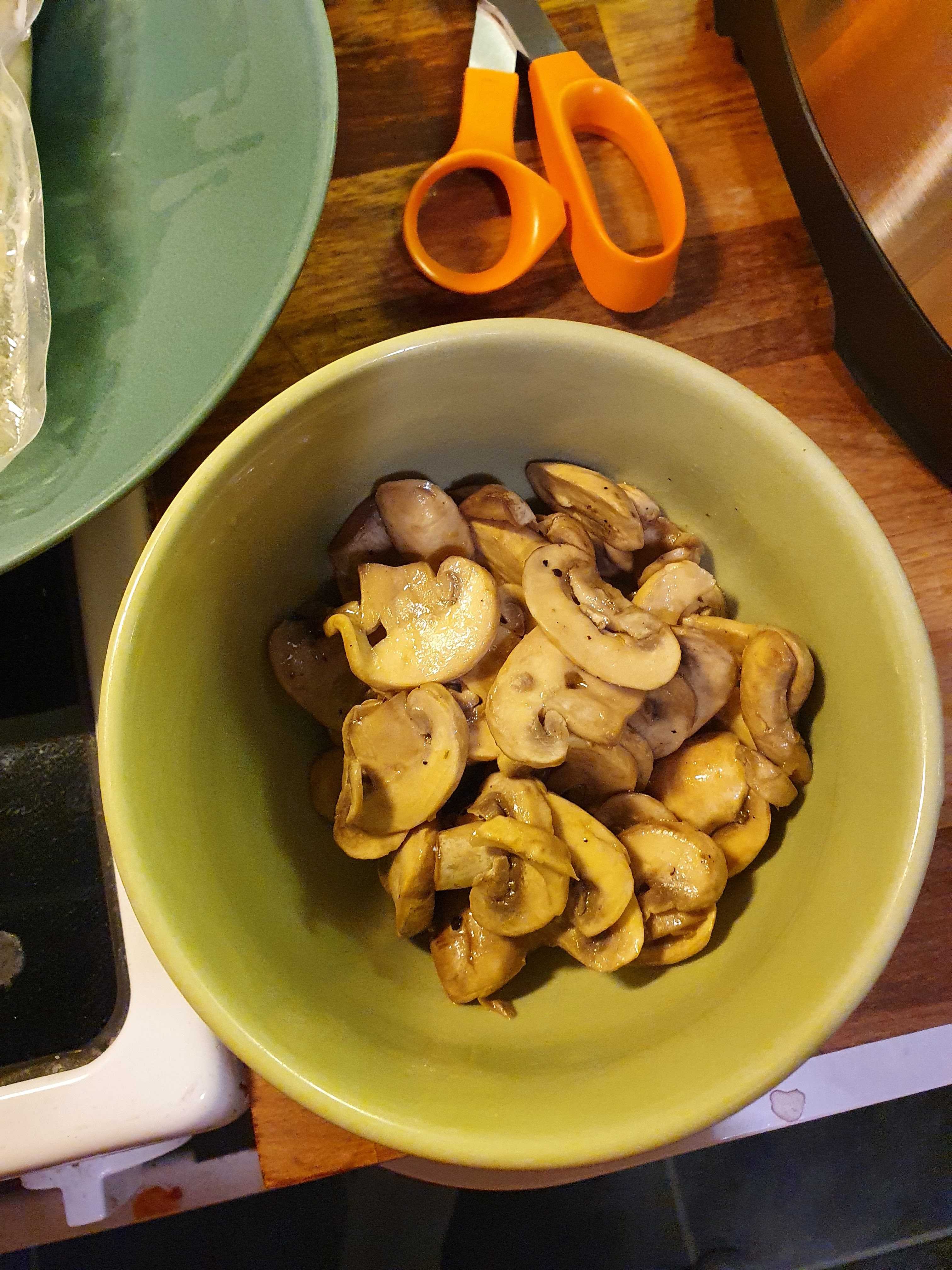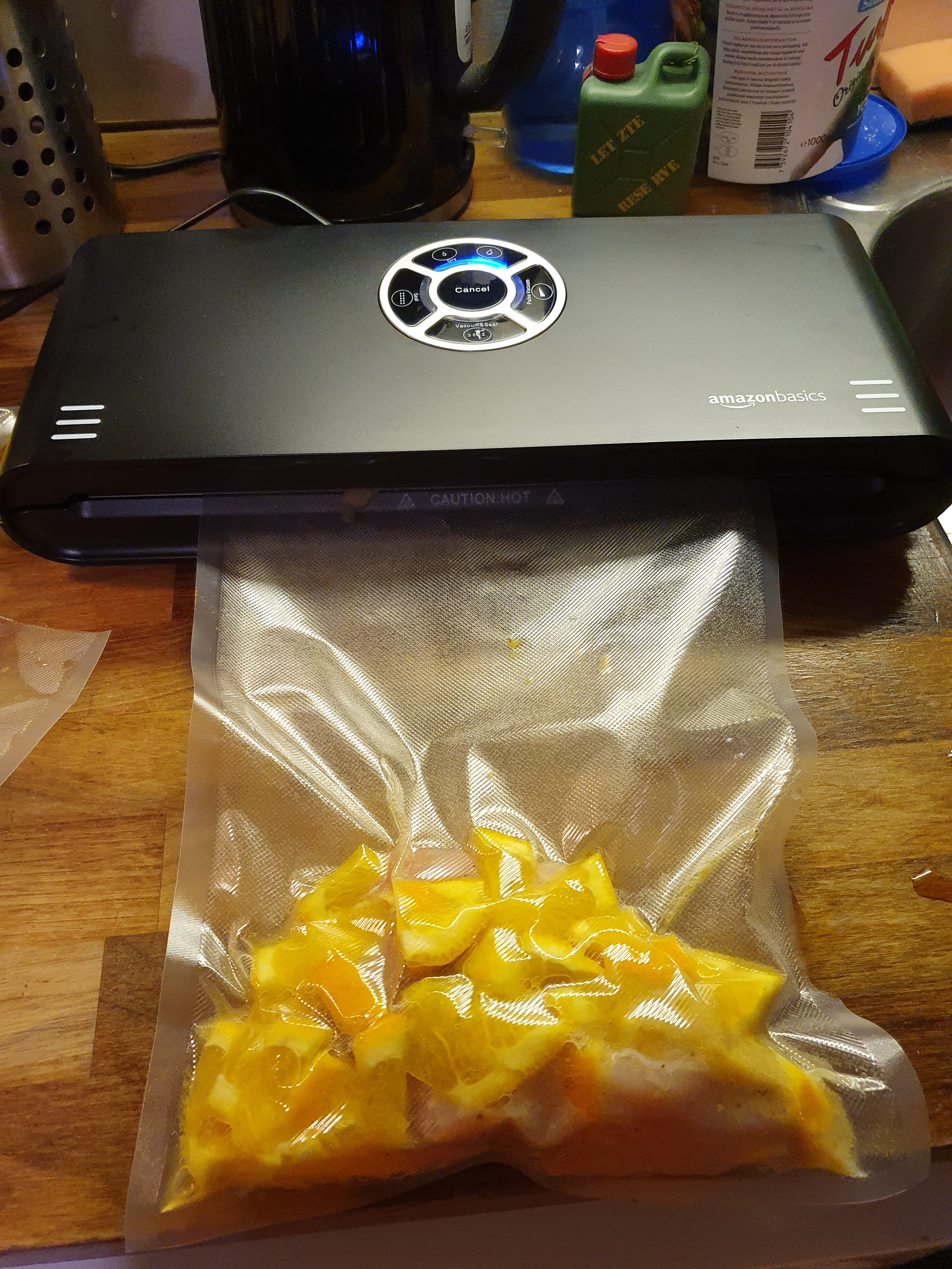 Käytin 200g luomuherkkusieniä, jotka pesaisin ja viipaloin jalkoineen. Sienten päälle ripottelin merisuolaa, kippasin 2rkl:sta soijaa, 2rkl:sta oliiviöljyä ja 2tl:sta väkiviinietikkaa. Sekaan jauhoin myllystä lime-pippuri-sekoitetta. Vastustin urhoollisesti kiusausta lisätä chiliä. Pistin komeuden pussiin, ravistelin ja työnsin vakuminaattoriin, joka hörppäsi puolet nesteestä ja jätti pussiin korvaukseksi ilmaa. Koska olin ensimmäistä kertaa kyseisen laitoksen kanssa tekemisissä, en tietenkään tajunnut valita ”moist” ja en tietenkään tajunnut että kun jotakin imetään pois, niin tietysti kaikki pesuallasta kevyempi on vaarassa päätyä ja päätyy vakuminaattorin sisään. No, jäi sitä tavaraa pussiinkin. Ja ehtivät ne sienet olla kulhossa vartin verran ennen pussitusta – seuraavalla kerralla laitan ne minigrippiin tuntia ennen ja tungen jääkaappiin vartoomaan. Sitten kaatelen isommat nesteet siivilän lävitse mieluummin suoraan viemäriin kun siivon vakuminaattorista.