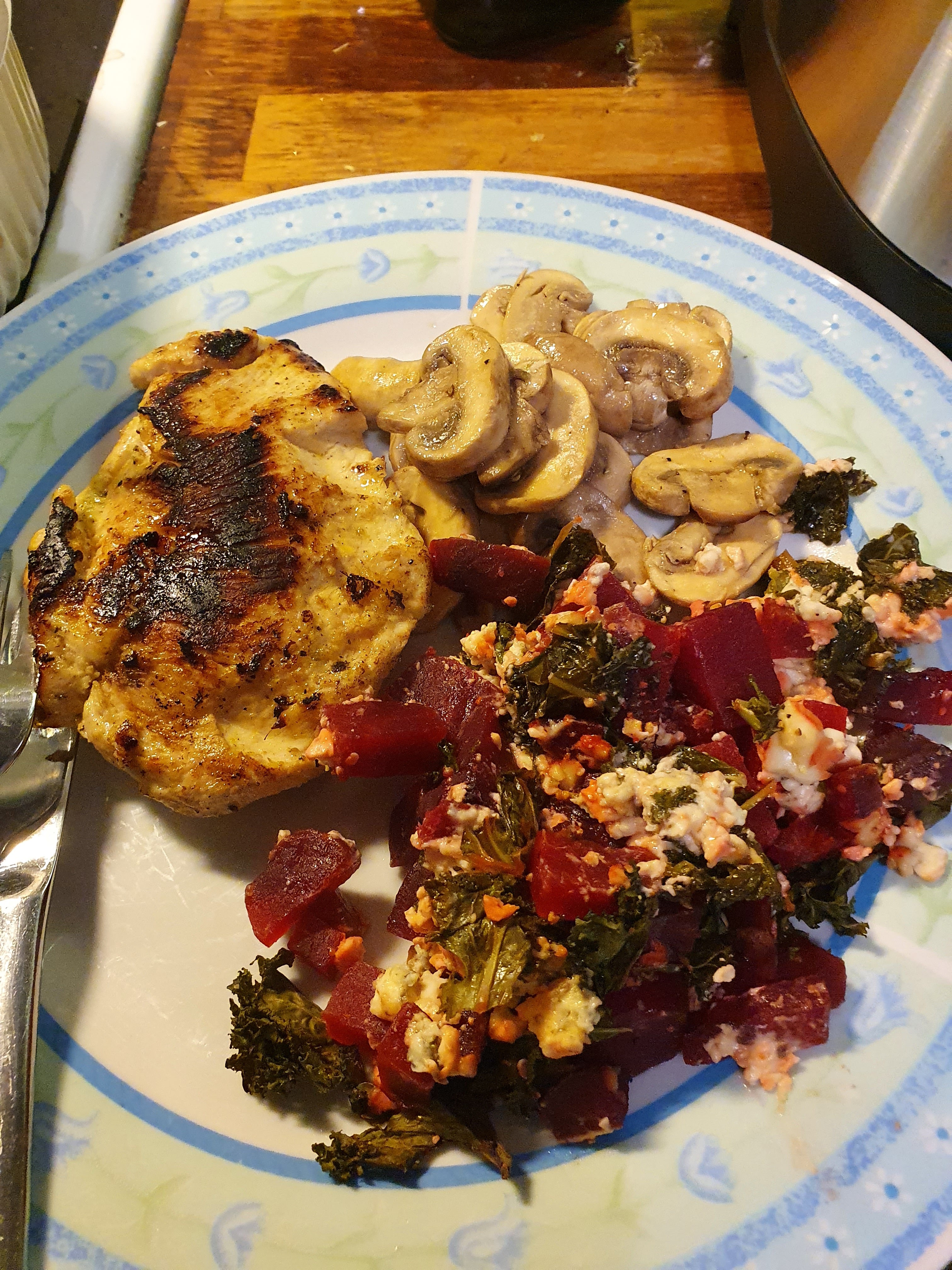 Ensimmäiseksi harjoitteeksi päätin suorittaa Lorttiaisen illalliseksi mielitekojen sirpaleita, eli appelsiini-inkivääri-sitruunaruoho-kanaa, sieniä ja kahdesti tapettuja punajuuria. Viimeinen on ruokalaji, joka yleensä kuuluu osaksi dekonstruoitua uunimakkaraa v2.0, mutta irroitettiin nyt kontekstistaan kokeilun vuoksi, valmistui uunissa.