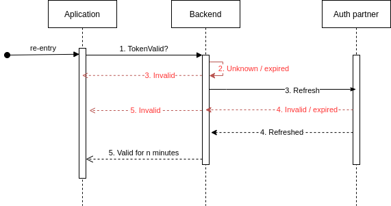 The goal here is to offer the most convenient way for the app to use the API – which means less opening browser windows and surprise ”access denied” or even worse ”redirects to auth providers”. To simplify state management in the app we should provide a simple GET to the backend which would validate the token and give expiration time for our bearer token. This simplified flow is described in the picture 2.