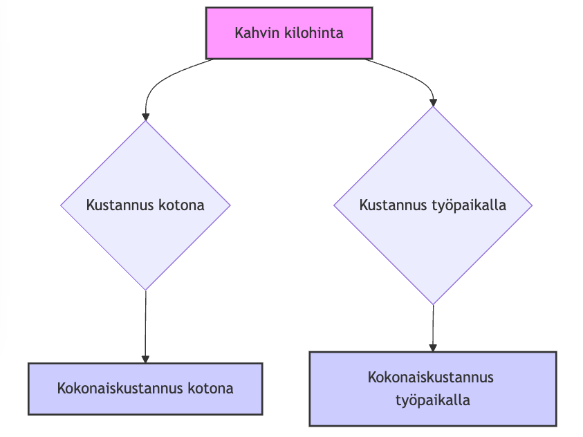Kilo kahvipapuja maksaa 22,95€. Yhteen mukiin kahvia menee 21g kahvipapuja. Juon kotona kaksi mukia kahvia. Työpaikalla en maksa kahvista mitään, mutta ostan kaksi vissyä automaatista. Yhden vissyn hinta on 0,50€. Paljonko kahvin kilohinnan täytyy nousta, jotta kannattaa tulla työpaikalle? Piirrätkö myös kaavion, jossa on kaksi käyrää, kustannus kotona ja kustannus töissä. x-akselilla on kahvin kilohinta ja y-akselilla kokonaiskustannus.