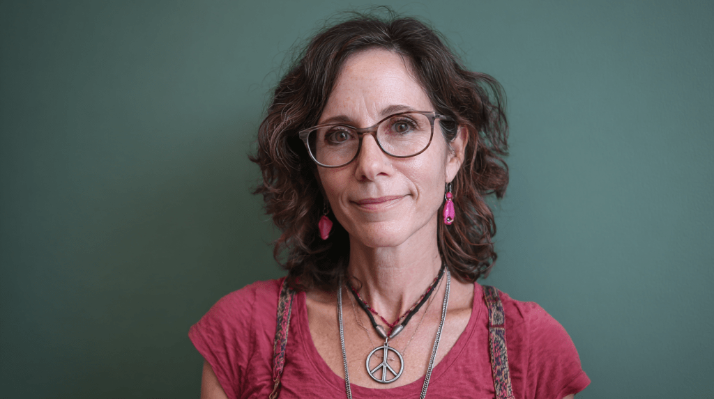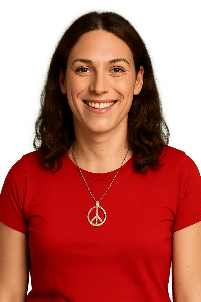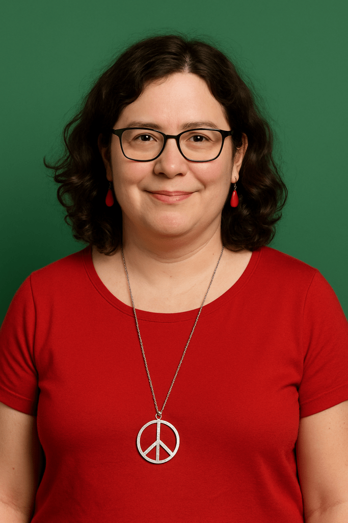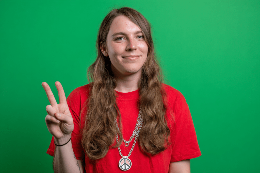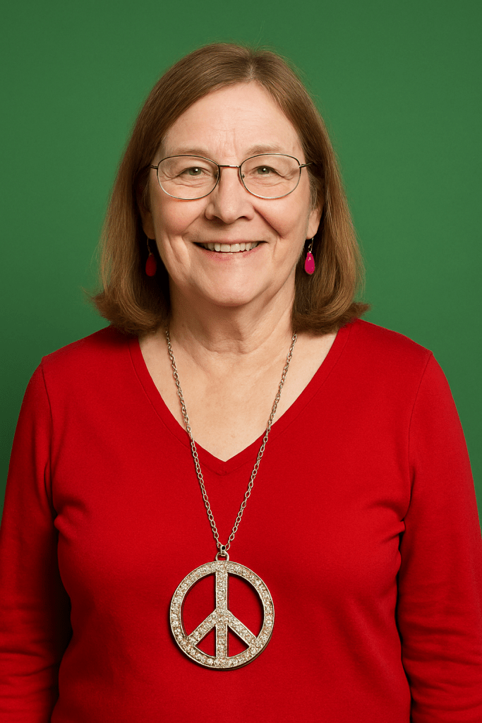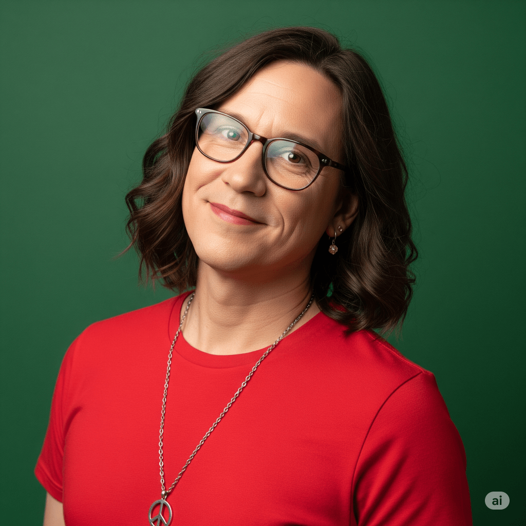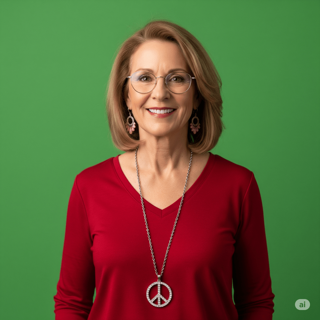 Kuvassa on ihminen, joka seisoo vihreän taustan edessä. Hänellä on päällään punainen pusero ja kaulassaan hopeanvärinen riipus, jossa on rauhanmerkki. Hänellä on myös lasit ja korvakorut.