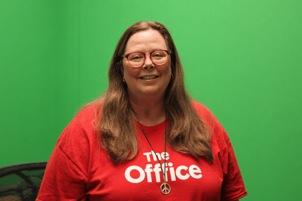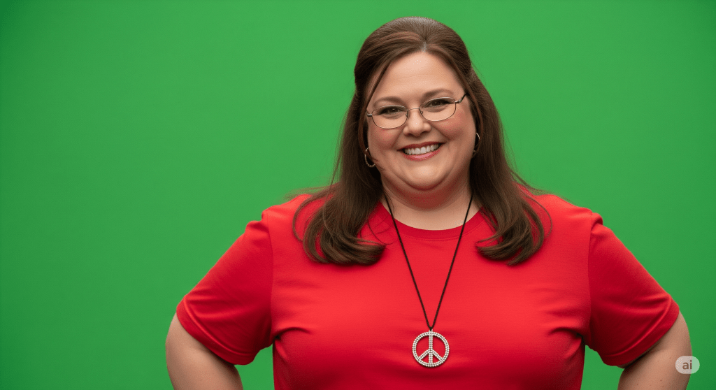 1️⃣ An overweight, middle-aged woman with glasses and long brown hair, wearing a red t-shirt and a peace symbol necklace, poses for the camera in front of a green screen background. This is a live-action screenshot from an episode of the TV show ”The Office”, with the woman smiling at the viewer. The image is photorealistic. –ar 128:85