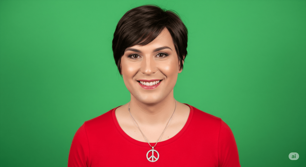 3️⃣ Footage of a transgender woman wearing a red T-shirt and a peace sign necklace, with a green screen background. –ar 128:85