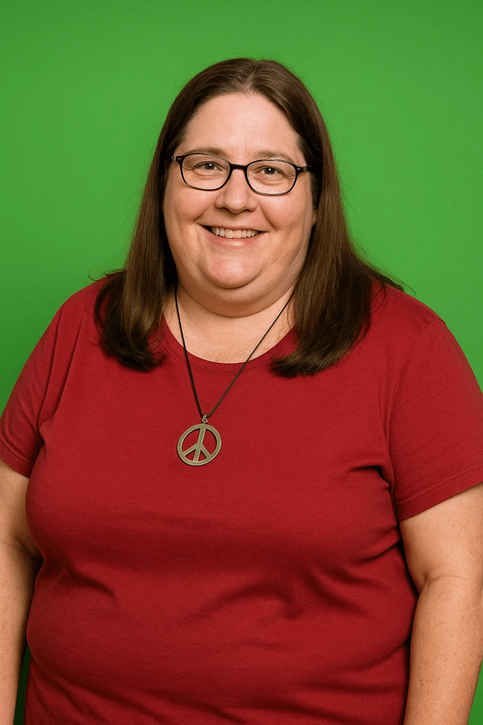 The person in the image is an adult wearing glasses. They have medium-length, wavy or curly brown hair that reaches their shoulders. They are wearing a red, short-sleeved top and a long, silver-colored necklace with a peace sign pendant. They also have pink earrings. The person has a slight smile and is looking directly at the camera. They are standing in front of a solid green background.